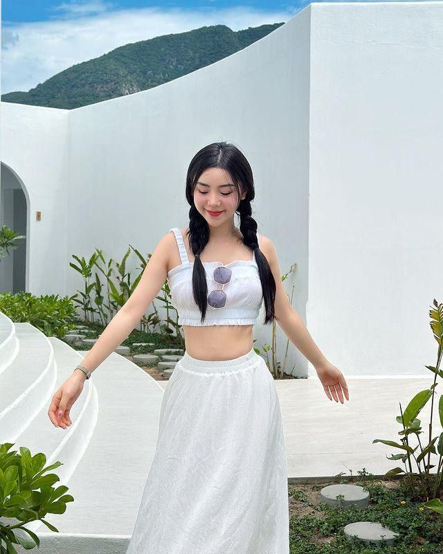 Cô diện outfit màu trắng dựa theo dresscode được chủ nhân bữa tiệc đặt ra là party trên biển. Set đồ được làm từ chất liệu voan xuyên thấu lấp ló nội y cọng thun bé tí bên trong. Combo nửa kín nửa hở đã tạo nên hiệu ứng hút mắt rất mạnh. Khoảnh khắc cô tạo dáng và chụp hình từ đằng sau còn leo top trending vì một nếp gấp ở vị trí đặc biệt.