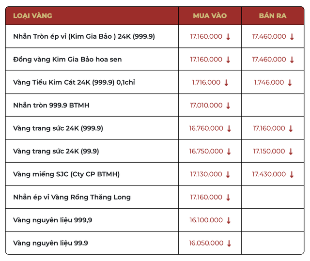Giá vàng nhẫn cũng ghi nhận mức sụt giảm từ 600 nghìn đồng đến 1,7 triệu đồng/lượng ở cả 2 chiều giao dịch. Hiện SJC đưa giá nhẫn trơn về khoảng 171 - 174 triệu đồng/lượng. Bảo Tín Mạnh Hải niêm yết tại ngưỡng 171,6 - 174,6 triệu đồng/lượng. Bảo Tín Minh Châu mua vào - bán ra trong khoảng 172 - 175 triệu đồng/lượng.