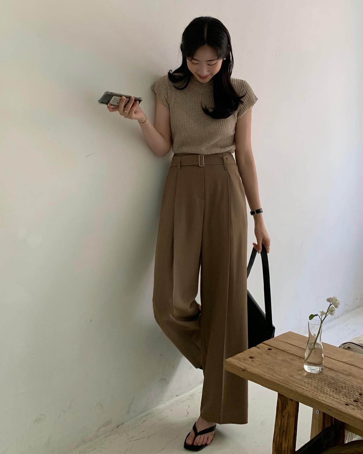 Chỉ cần một chiếc quần nâu ống rộng có phom dáng đẹp, chị em đã có thể tạo nên nhiều outfit thanh lịch mà không cần quá nhiều chi tiết cầu kỳ.