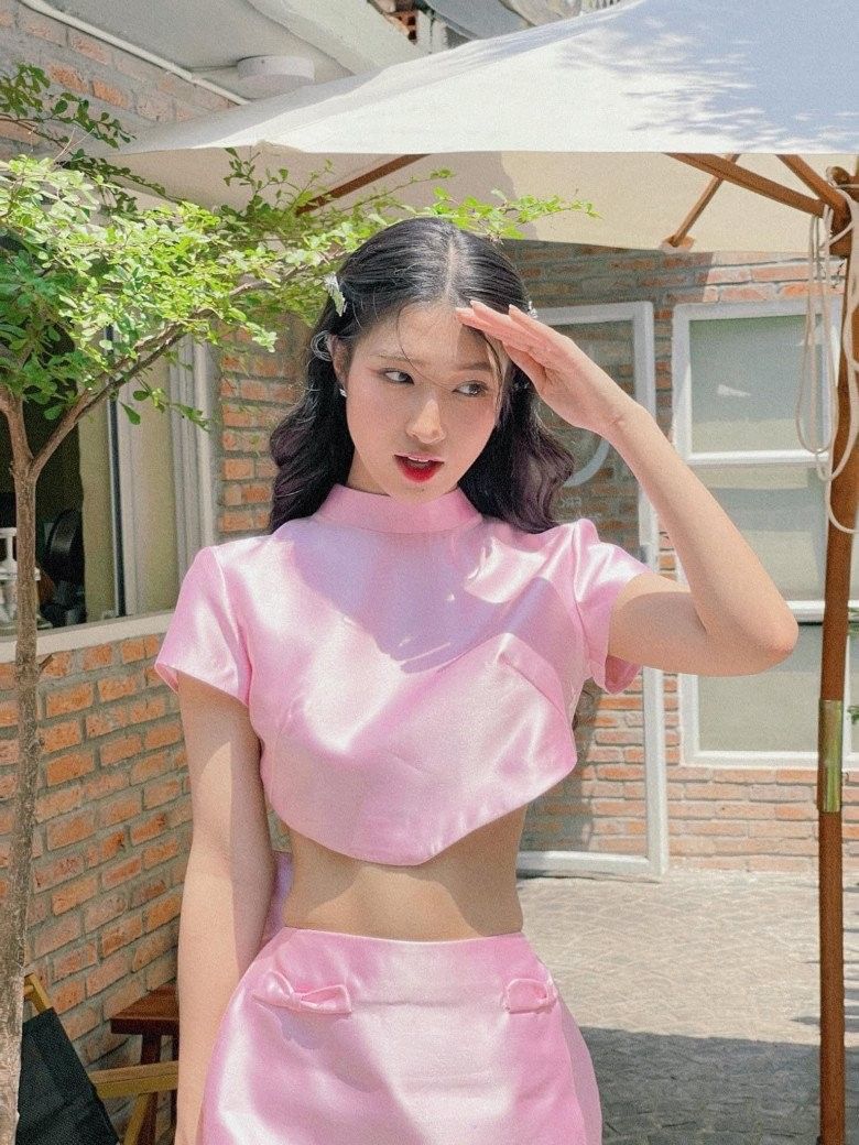 Phương Nhi khoe eo thon săn chắc với set đồ hồng tuyệt đẹp.