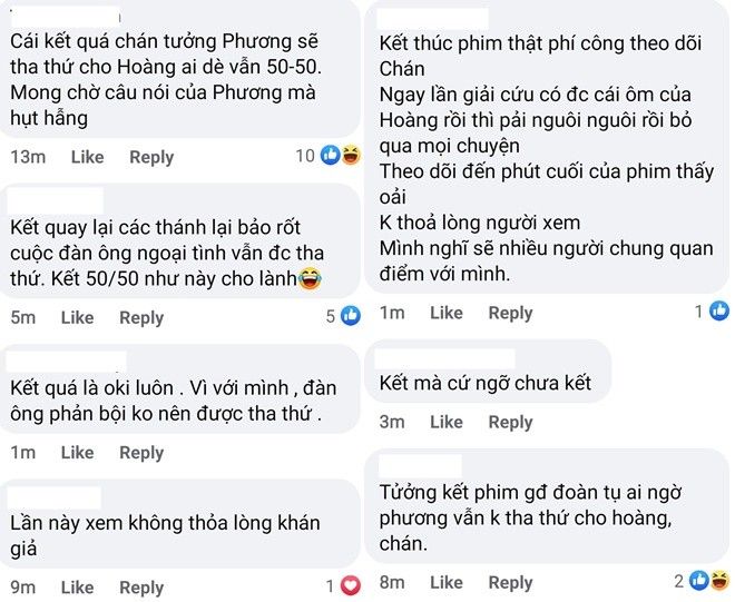 Tuy nhiên đến phút cuối cùng, Phương chỉ rơi nước mắt mà không hề nói có tha thứ cho Hoàng hay không. Vài tháng sau vụ việc, vợ chồng Hoàng và Phương vẫn chưa về cùng nhau. Hai đứa trẻ ở cùng mẹ, tuy nhiên Phương thoải mái để Hoàng tới nhà, chăm sóc con cái và giúp đỡ cô. Trong tuần, Hoàng sẽ thu xếp lịch đón hai con đi học. Duy chỉ có vợ chồng Nguyệt (Thu Quỳnh) có kết thúc hạnh phúc khi Nguyệt cuối cùng cũng mang bầu.