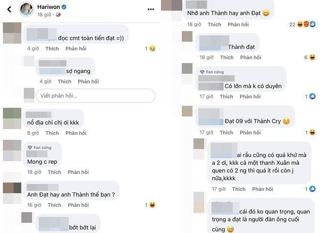 Đây không phải là lần đầu tiên Hari Won "thả thính" và tình cũ Tiến Đạt bị nhắc tên ở phần bình luận. Có lần, cô đăng lên trang cá nhân dòng chú thích: "Mỗi lần đọc tin nhắn anh, miệng em auto cười. Giờ anh có nhắn tin cho em nữa hay không nè?". Kèm theo chia sẻ ngọt ngào, Hari Won đăng bức ảnh mặc gợi cảm nằm trên giường, khoe làn da trắng nõn nà. Phía dưới bài viết, rất nhiều người đã để lại bình luận kém duyên khi nhắc đến tình cũ của Hari Won. Thậm chí, một người mỉa mai: "Anh Đạt nhắn tin thả thính à".