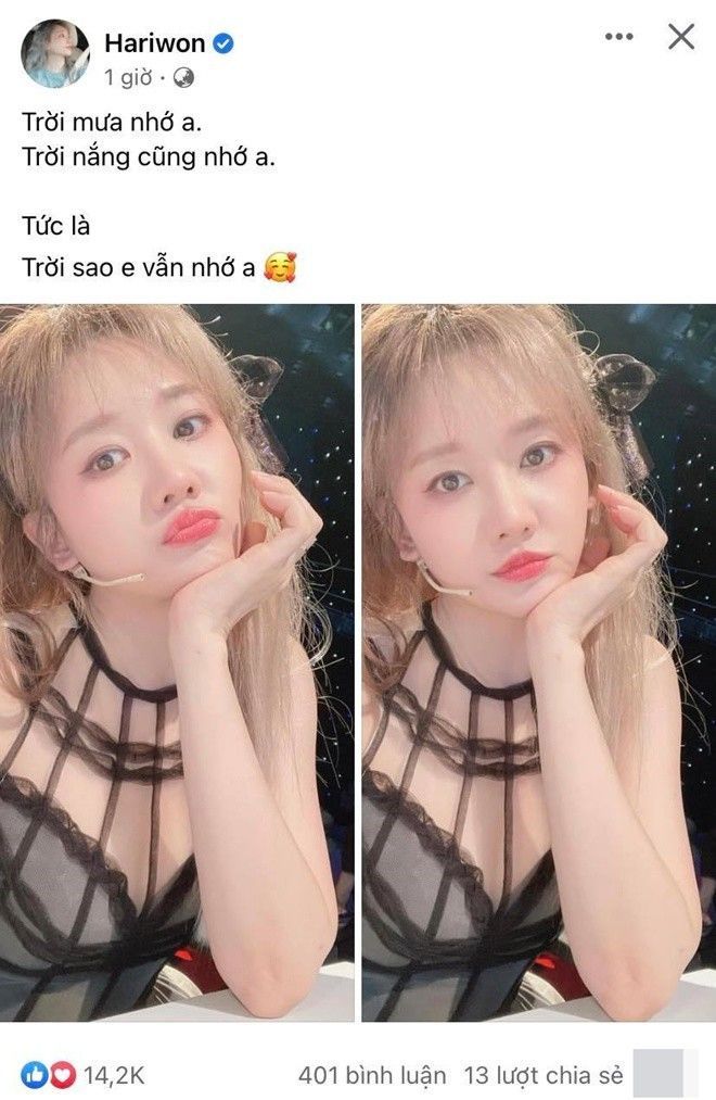 Một lần khác, Hari Won lại có chia sẻ đậm chất "thả thính" khi cho biết mình đang nhớ ai đó bất kể trời nắng hay mưa. Cụ thể, nữ ca sĩ viết: "Trời mưa nhớ anh. Trời nắng cũng nhớ anh. Tức là… trời sao em vẫn nhớ anh". Câu cuối "chơi chữ" khi nhắc tới "trời sao" sau trời mưa và trời nắng, nhưng cũng là câu cảm thán: "Trời ơi sao em vẫn nhớ anh".