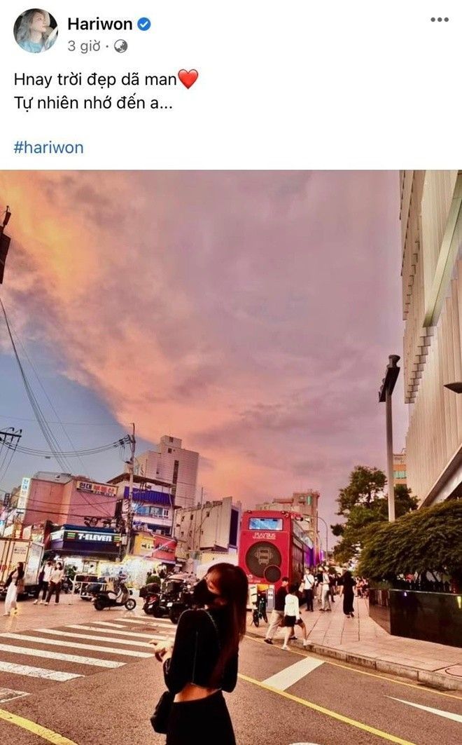 Trên trang cá nhân, Hari Won khoe khoảnh khắc thả dáng giữa con phố tấp nập ở Hàn Quốc kèm dòng chú thích đáng chú ý: "Hôm nay trời đẹp dã man. Tự nhiên nhớ đến anh…". Việc nữ ca sĩ viết dấu ba chấm lấp lửng sau chữ "anh", không ghi rõ danh tính ai là người mình đang nhung nhớ đã khiến bài đăng của cô nhận về lượt tương tác "khủng" với 26.000 lượt thích cùng hơn 500 bình luận.