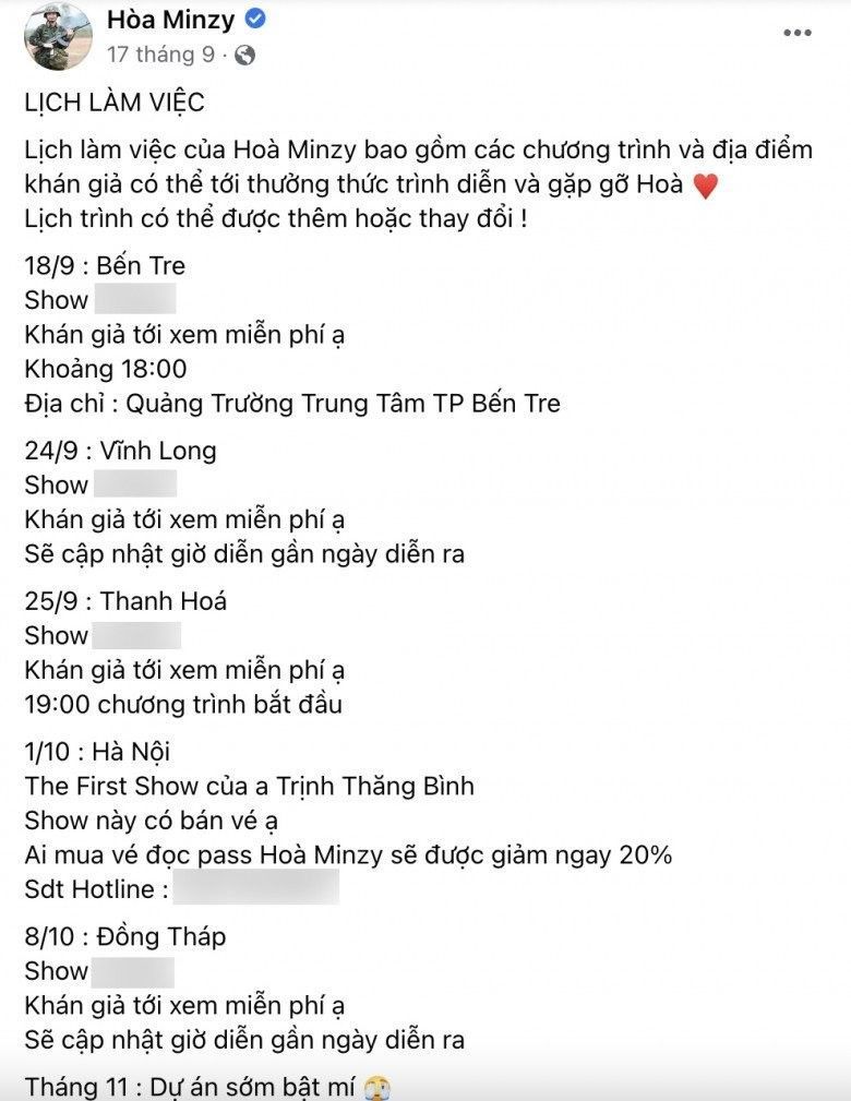 Lịch diễn của Hòa Minzy được cập nhật và thêm mới liên tục.