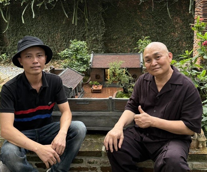 Xuân Hinh và tác giả của phiên bản nhà mini bên mô hình ngôi nhà gạch đỏ truyền thống. Từng chi tiết nhỏ đều được chăm chút tỉ mỉ, tái hiện đúng không gian tuổi thơ danh hài.