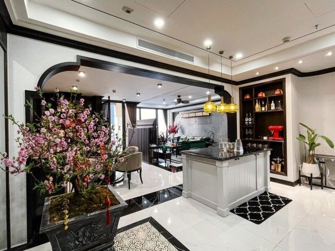 Căn hộ ban đầu được bàn giao với 3 phòng ngủ nhưng vì sống một mình nên nữ diễn viên đã cho đập bỏ một phòng ngủ để tăng diện tích của phòng khách. Là người thích nấu nướng, nữ diễn viên chăm chút không gian bếp. Cô thiết kế phòng khách, bếp và bàn ăn thông nhau.