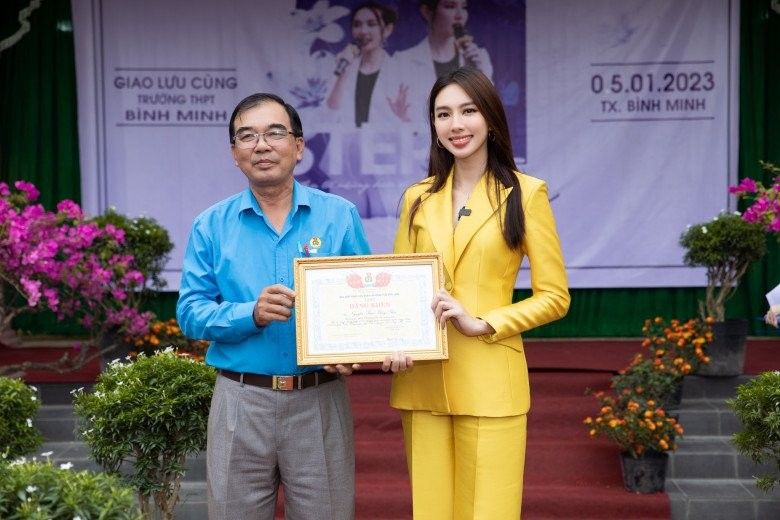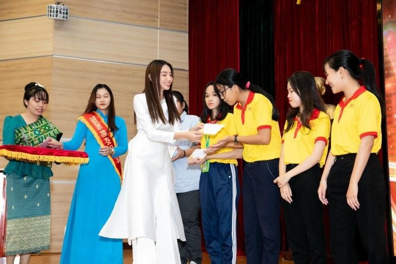 Người đẹp không chỉ hoạt động showbiz với vai trò người mẫu, ngôi sao nổi tiếng mà cô còn là sứ giả truyền cảm hứng của các trường học. Đến mỗi nơi, cô lại lựa chọn trang phục phù hợp.