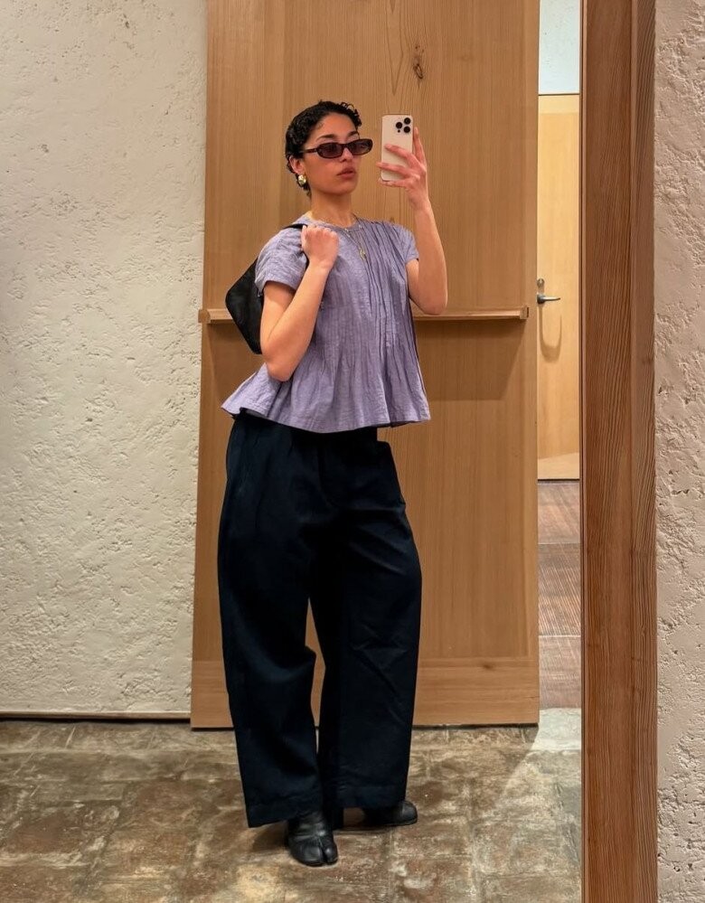 Áo blouse giúp cân bằng sự mạnh mẽ của barrel pants bằng nét mềm mại, nữ tính. Những chi tiết như tay bồng hay chất liệu nhẹ tạo cảm giác nhẹ nhàng hơn. Khi kết hợp, outfit vừa hiện đại vừa tinh tế, phù hợp nhiều hoàn cảnh khác nhau.