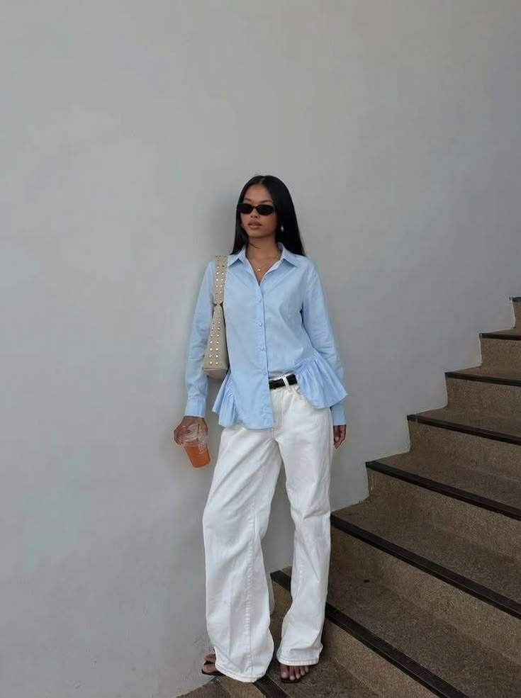 Phối barrel pants với áo sơ mi là lựa chọn lý tưởng cho những ai theo đuổi phong cách công sở hiện đại. Sự chỉn chu của áo sơ mi giúp cân bằng lại phom dáng phá cách của quần, tạo nên tổng thể vừa lịch sự vừa thú vị.