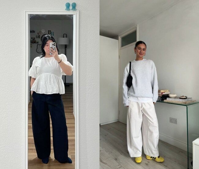 Đây là công thức đặc biệt phù hợp với những ai muốn "hack dáng" mà không cần đến giày cao gót. Ngoài croptop, chị em cũng có thể chọn áo sơ mi hoặc áo thun dáng lửng để giữ sự kín đáo nhưng vẫn đạt hiệu quả tương tự. Khi hoàn thiện outfit với giày mũi nhọn hoặc sandal tối giản, tổng thể sẽ trở nên thanh thoát hơn, tránh cảm giác bị "nuốt dáng" do form quần rộng.