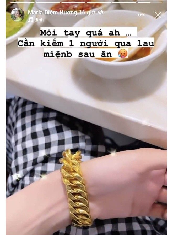 Cụ thể, trên trang cá nhân, Hoa hậu Diễm Hương đăng tải loạt ảnh đeo trang sức đầy người từ dây chuyền, lắc tay đến nhẫn kim cương. Mỗi món trang sức đều có kích thước "khủng", trong đó cô tiết lộ chiếc lắc tay có định lượng 3 cây vàng, dây chuyền là 4 cây vàng, chiếc nhẫn kim cương tiền tỷ. Hoa hậu Thế giới người Việt 2010 viết: "Nhiều khi thấy 'nặng nề' quá, cái lắc có 3 cây, cái trên cổ 4 cây, rồi trên tay tự nhiên mang cả căn hộ 2 phòng ngủ lên. Ta nói mệt ơi là mệt, cần kiếm người làm nhẹ nhàng cuộc sống".