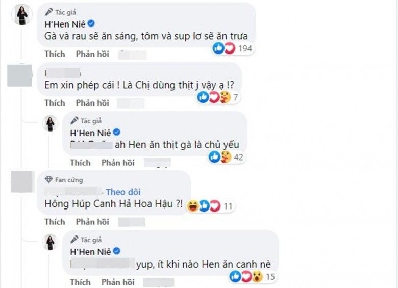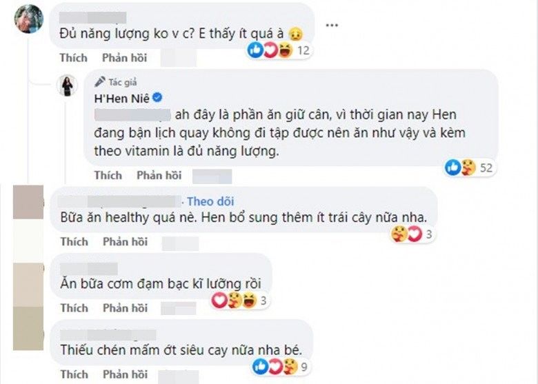 Nhiều người tò mò và lo lắng rằng liệu cô có ăn ít quá hay không, H'Hen Niê trả lời, phần ăn chụp kể trên chỉ là để giữ cân. Cô cũng đồng thời bổ sung thêm thực phẩm chức năng là vitamin để đủ năng lượng hoạt động.