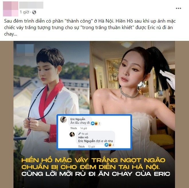 "Sau đêm trình diễn có phần 'thành công' ở Hà Nội, Hiền Hồ sau khi up ảnh mặc chiếc váy trắng tượng trưng cho sự 'trong trắng thuần khiết', được Eric rủ đi ăn chay", một diễn đàn bàn chuyện showbiz lớn viết dòng chú thích ẩn ý, nhận về 4.000 lượt thích.