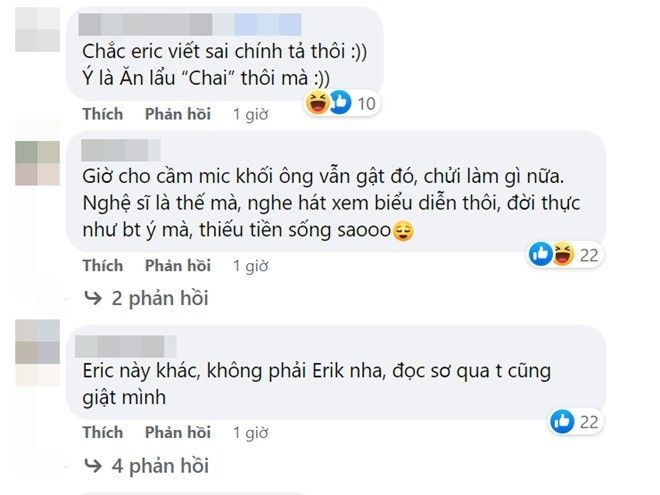 Phía dưới bài đăng, nhiều người cũng phát hiện ra sự "nhập nhèm" này và để lại bình luận: "Chắc Eric viết sai chính tả thôi", "Anti luôn Erik", "Eric này là anh hair stylist mấy ba ơi", "Eric này khác, không phải Erik nha, đọc sơ qua tôi cũng giật mình", "Này là Eric chứ không phải Erik nha", "Đây không phải Erik kia", "Thương em Ê-zíc"…
