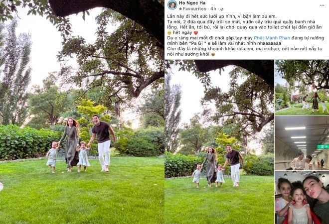 "Nữ hoàng giải trí" hóm hỉnh viết: "Lần này đi hết sức lười up hình, vì bận làm zú em. Ta nói, 2 đứa qua đây trời se mát, vườn cây trĩu quả quậy banh nhà lồng. Hết ăn, tới bú, rồi lại chơi quay qua vào toilet chút lại đến giờ ăn, hết ngày".