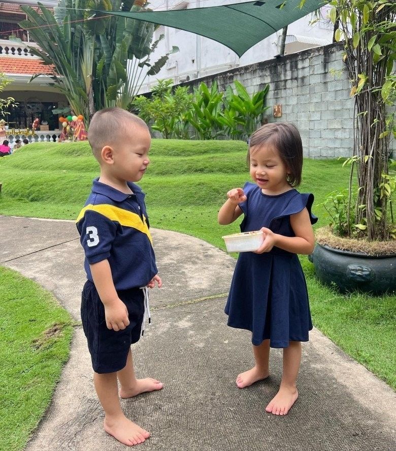 Bên cạnh đó, cặp song sinh được bố mẹ diện bộ đồ đôi cùng màu, mang bánh kẹo để đi mời các bạn cùng trường. Không gian trường học rộng rãi nên các bạn học cũng được thưởng thức bữa tiệc sinh nhật Leon và Lisa tùy thích. Hồ Ngọc Hà, mẹ đẻ và Kim Lý cùng có mặt ở trường để làm lễ sinh nhật cho các con. Nữ ca sĩ thì không lộ diện vì là người cầm máy quay, chỉ lộ giọng nói nhưng Kim Lý thì ăn mặc rất đơn giản như thường ngày, áo phông và quần ngắn.