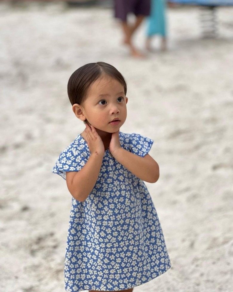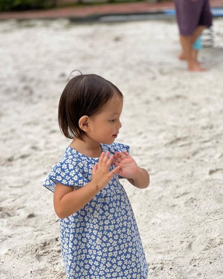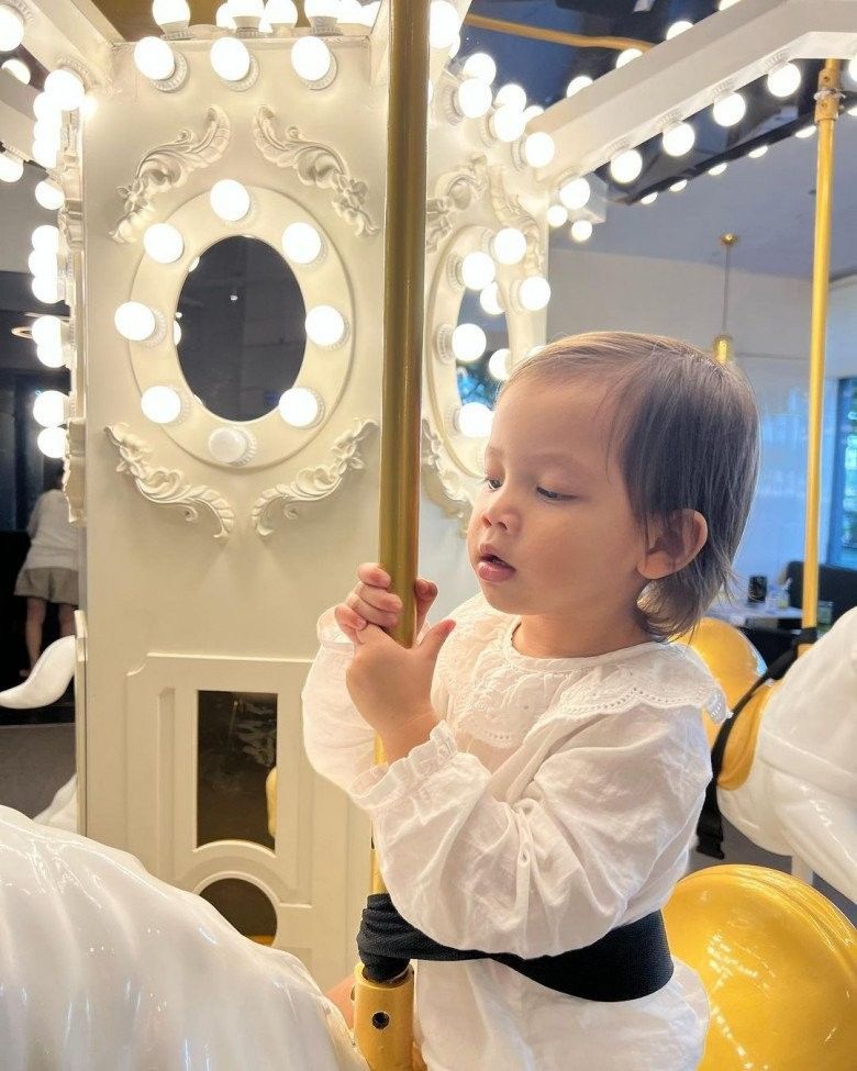 Khi tóc dài hơn, thiên thần lai bắt đầu được mẹ chăm chút hơn. Trong 1 lần đi chơi công viên, Lisa diện thiết kế váy hoa nhí, tóc "bổ luống" hệt mẹ Hà. Tấm hình mắt long lanh của em bé như phiên"bản đúp" chất lượng của Hồ Ngọc Hà.