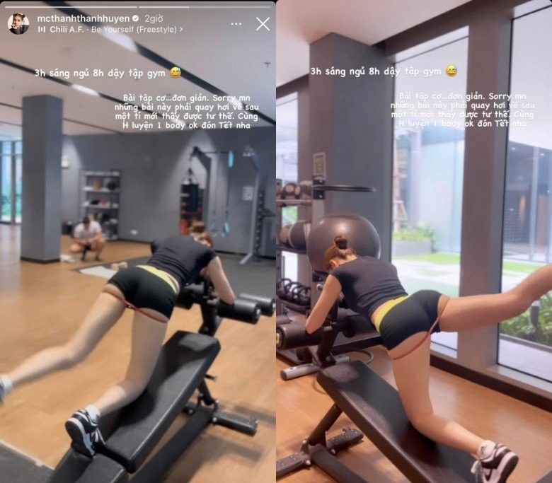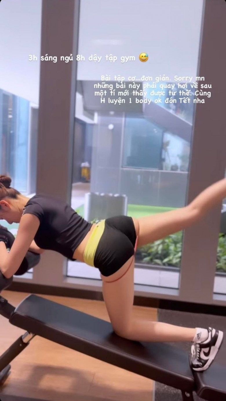 Dù bận bịu công việc, không có nhiều thời gian ngủ nhưng cô vẫn ý thức được việc sắp xếp để tập luyện thể thao. Người đẹp hé lộ 3h sáng ngủ nhưng 8h vẫn dậy tập gym. Cô chia sẻ, đây là bài tập cơ đơn giản mà bất cứ ai cũng có thể học theo để cải thiện vòng 3. Cô tinh tế nói lời xin lỗi vì góc quay có hơi gợi cảm: "Xin lỗi mọi người, những bài này phải quay hơi về sau một tí mới thấy được tư thế. Cùng Huyền luyện 1 body đón Tết nha".