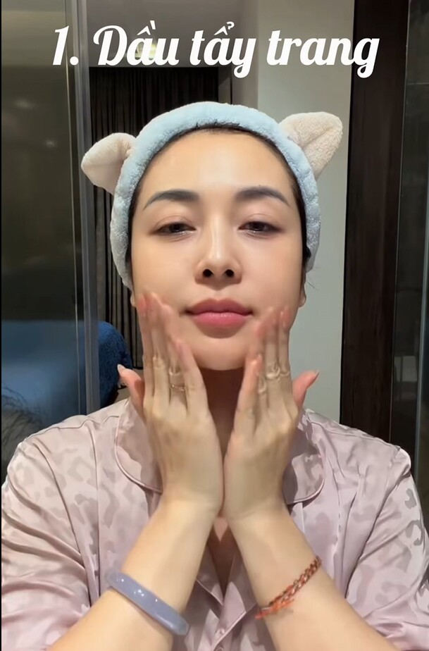 Bà mẹ 4 con bắt đầu với bước tẩy trang bằng dầu để nhẹ nhàng cuốn trôi bụi bẩn, kem chống nắng và lớp trang điểm sau một ngày dài. Đây được xem là nền tảng quan trọng giúp làn da “giải phóng” hoàn toàn trước khi bước vào các công đoạn chăm sóc chuyên sâu.