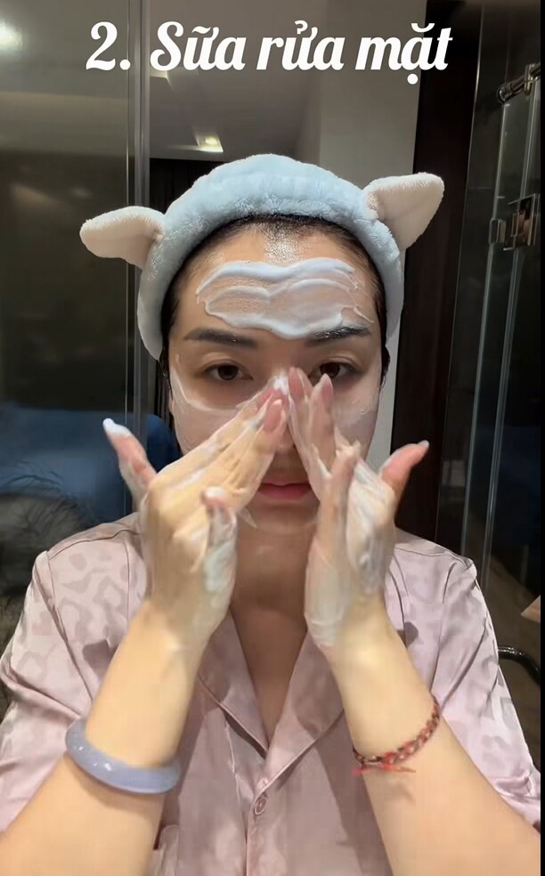 Đây là bước mà nàng hậu đặc biệt nhấn mạnh không bao giờ làm qua loa. Với Jennifer Phạm, làm sạch kỹ chính là điều kiện tiên quyết: chỉ khi da thực sự sạch, các bước dưỡng phía sau mới phát huy hiệu quả tối đa.