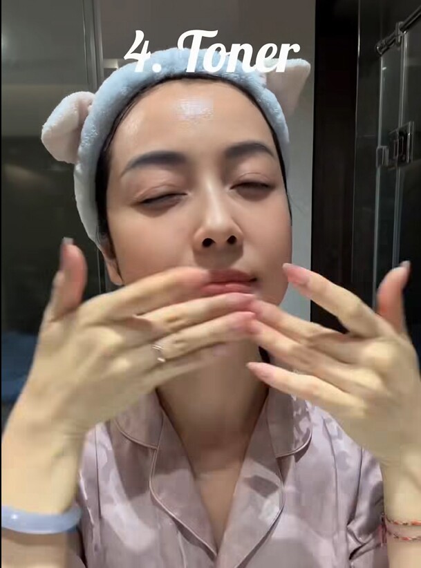 Sau khi làm sạch sâu, Jennifer Phạm chuyển sang toner, bước tuy nhỏ nhưng đóng vai trò cân bằng, giúp làn da “dễ thở” và sẵn sàng hấp thụ dưỡng chất.