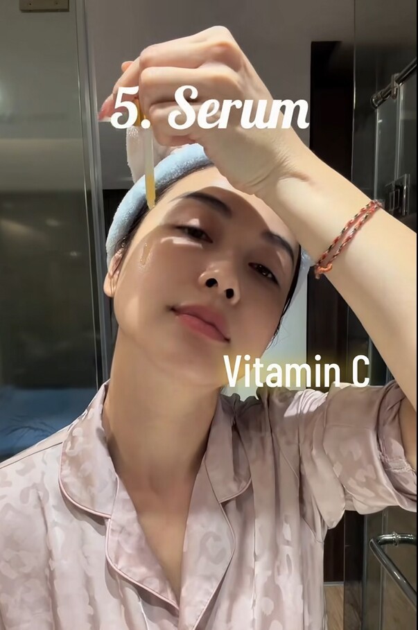 Ở bước này, người đẹp sử dụng kết hợp hai loại: một loại chứa Retinol nhẹ để hỗ trợ tái tạo da, và vitamin C giúp làn da luôn tươi tắn, tràn đầy sức sống. Sự kết hợp này cho thấy cách chăm da có định hướng, không chạy theo xu hướng mà tập trung vào hiệu quả lâu dài.