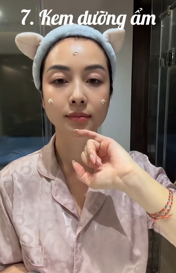 Tiếp theo là kem dưỡng ẩm để “khóa” lại toàn bộ dưỡng chất, duy trì độ ẩm cần thiết cho da suốt nhiều giờ. Đây cũng là bí quyết giúp làn da của bà mẹ 4 con luôn trong trạng thái đủ ẩm, hạn chế xỉn màu hay bong tróc.