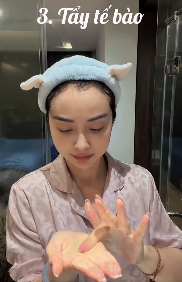 Mỹ nhân duy trì tẩy tế bào chết cách ngày như một cách “reset” làn da. Công đoạn này giúp loại bỏ lớp da xỉn màu, hỗ trợ tái tạo và mang lại bề mặt da mịn màng, tươi mới hơn.