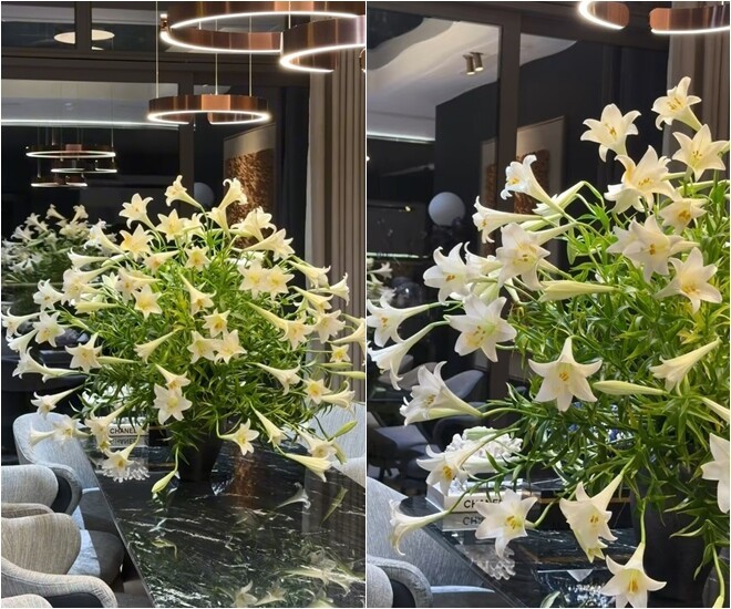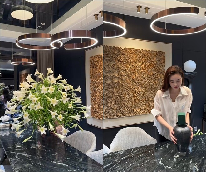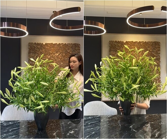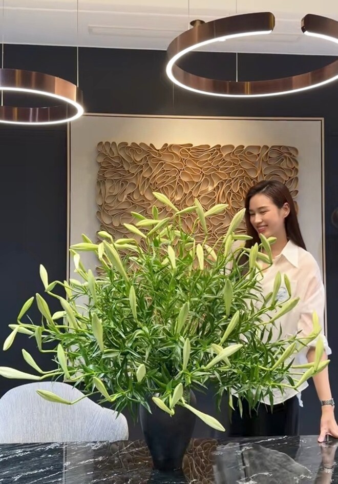 Toàn cảnh bình hoa loa kèn khi nở rực rỡ, chiếm trọn sự chú ý trong phòng khách của Hoa hậu Việt Nam 2020. Sự kết hợp giữa sắc trắng tinh khôi và mặt bàn đá đen vân mây mang lại hiệu ứng thị giác đẳng cấp.