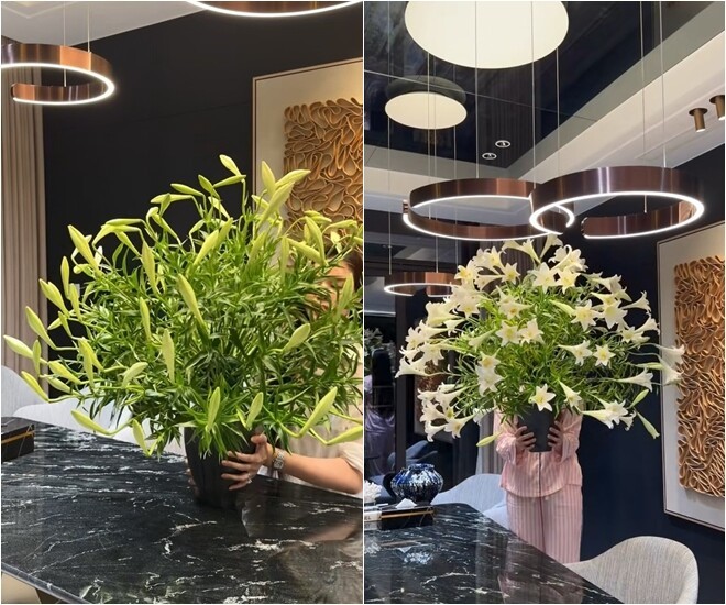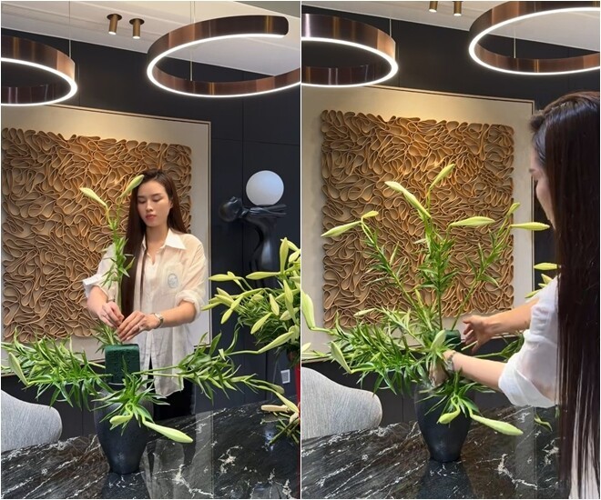 Từng cành hoa được cắt tỉa lá và cắm vào mút xốp theo hướng từ dưới lên trên, từ ngoài vào trong. Không gian sống hiện đại nhà nàng hậu càng thêm sang trọng khi được tô điểm bằng những bông loa kèn trắng.