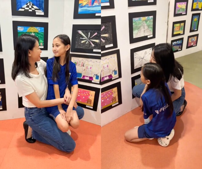 Hoa hậu Hà Kiều Anh tự hào khoe tranh con gái vẽ được triển lãm ở trường.