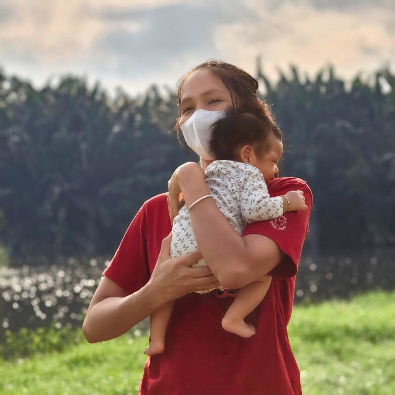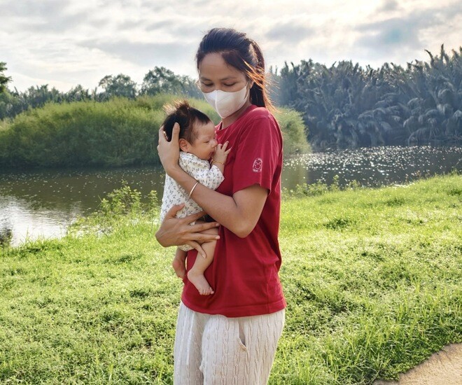 Mẹ bỉm cẩn thận đeo khẩu trang khi đưa ái nữ đi tắm nắng.