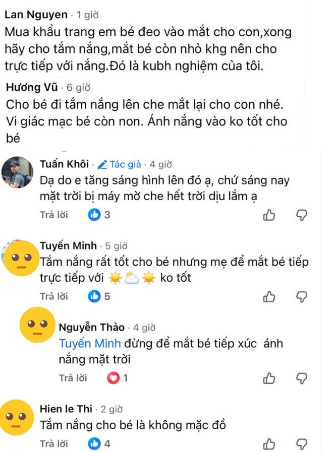 "Khi cho bé đi tắm nắng, mẹ nhớ che mắt lại cho con nhé. Giác mạc của bé còn non, ánh nắng chiếu trực tiếp vào mắt không tốt cho bé".