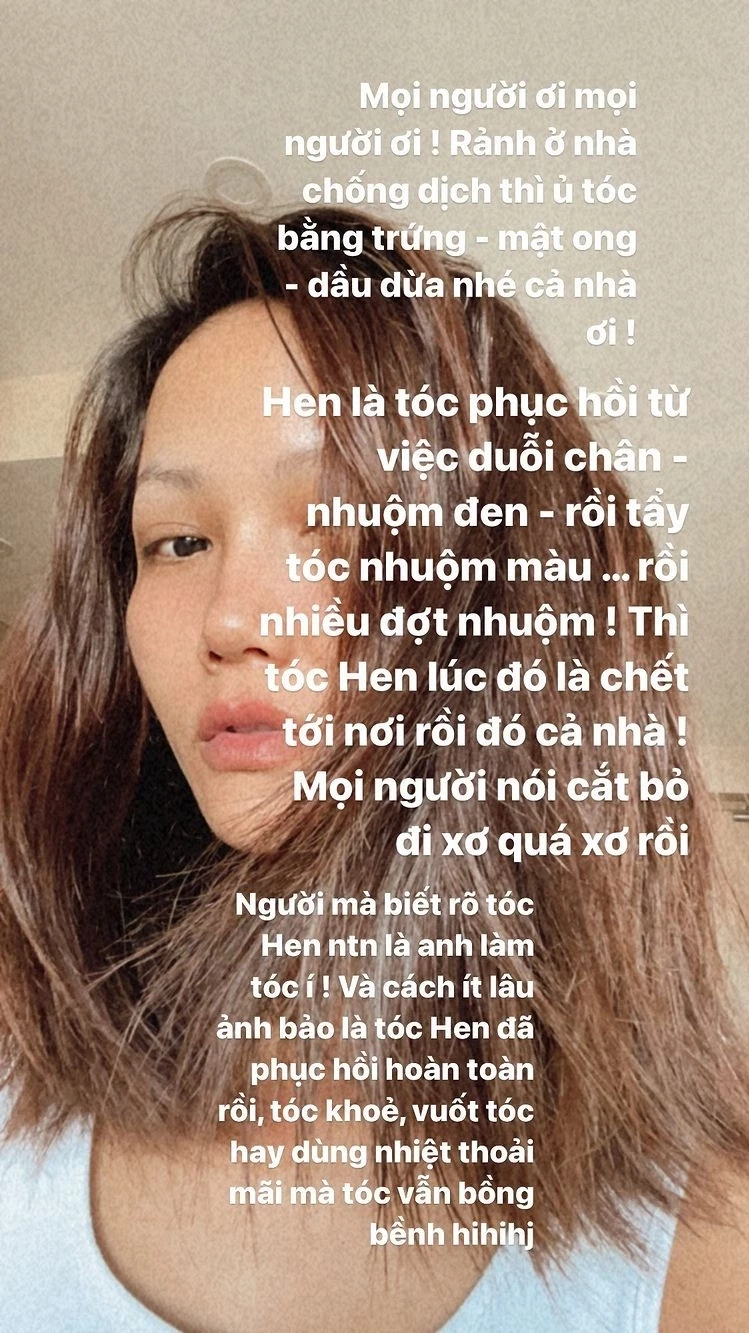 Trên trang cá nhân, H'Hen Niê từng chia sẻ loạt hình ảnh khoe mái tóc dài óng ả, suôn mượt. Đi kèm với đó, nàng Hậu tiết lộ bí quyết giản dị mà cô thường áp dụng chính là sử dụng nước nấu từ vỏ bưởi. "Nấu vỏ bưởi cho tóc mọc tung tăng, bóng đen tuyền, dáng tóc mượt mà!", H'Hen Niê nói.