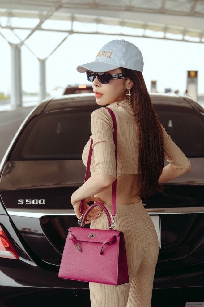 Lên đường sang Bangkok vào hôm 29/6, Hoa hậu Hoàng Dung diện trang phục trẻ trung và thời thượng ra sân bay Nội Bài. Set đồ tông nude gồm áo crop top và quần skinny bó sát không chỉ giúp cô khoe khéo vòng eo "con kiến" 52cm mà còn tôn lên đường cong cơ thể đầy gợi cảm. Kết hợp cùng sandal cao gót, túi hàng hiệu, mũ lưỡi trai và kính mắt cá tính, Hoàng Dung khẳng định phong cách của một biểu tượng thời trang, "tay chơi" hàng hiệu đẳng cấp.