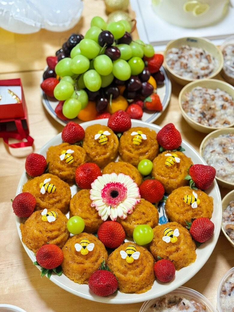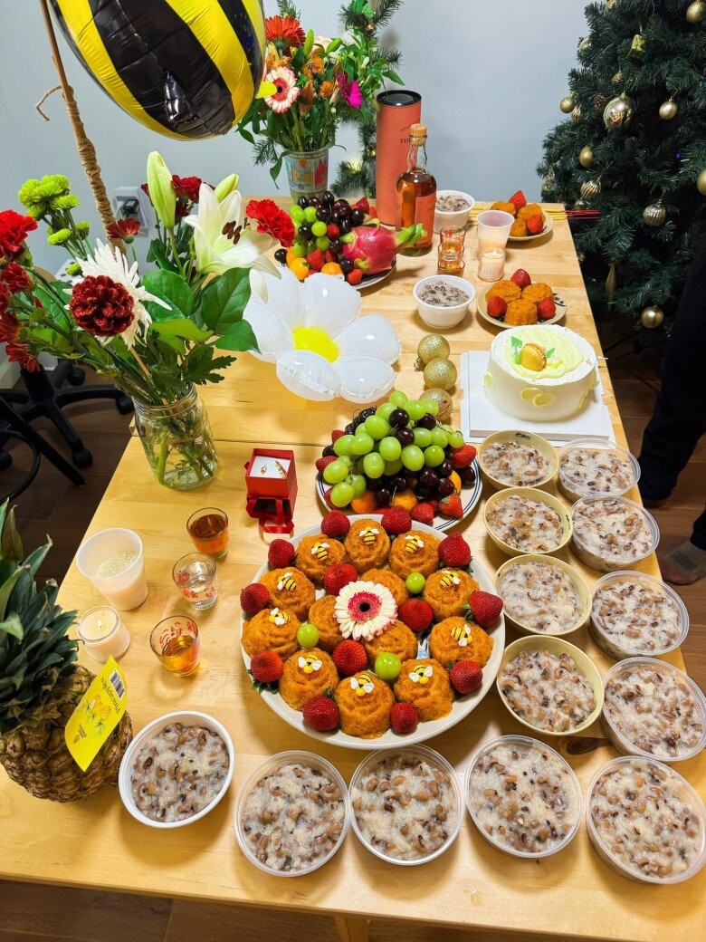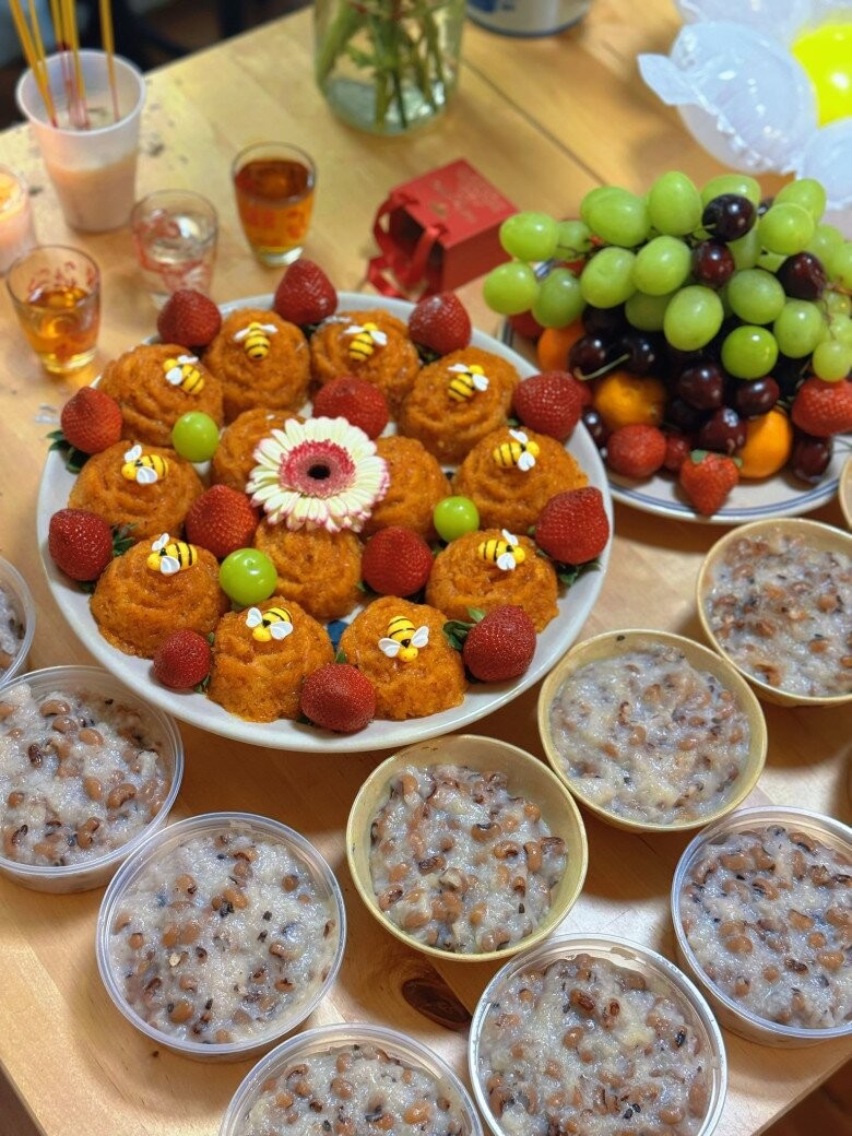 Nàng hậu cho biết, mâm cúng do đích thân mẹ cô chuẩn bị. "Nếu không có bà ngoại và ông ngoại, chắc chắn bé của ba mẹ đã không có 1 lễ cúng đầy tháng ý nghĩa vậy. Bà ngoại ngâm nếp từ đêm hôm trước, rửa đậu vô số lần. Ngoại còn mua sẵn khuôn và cả hình những chú ong nhỏ từ Việt Nam mang sang. Từng chút một là tình yêu ngoại dành cho con cháu.