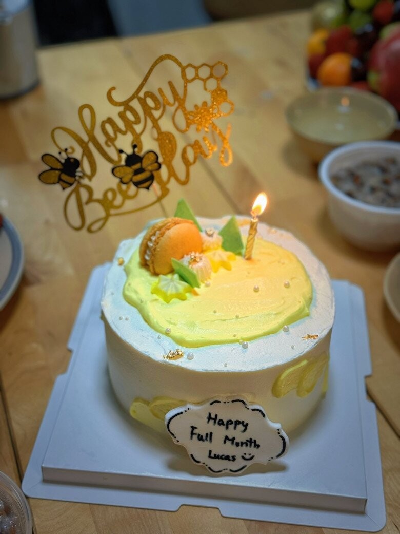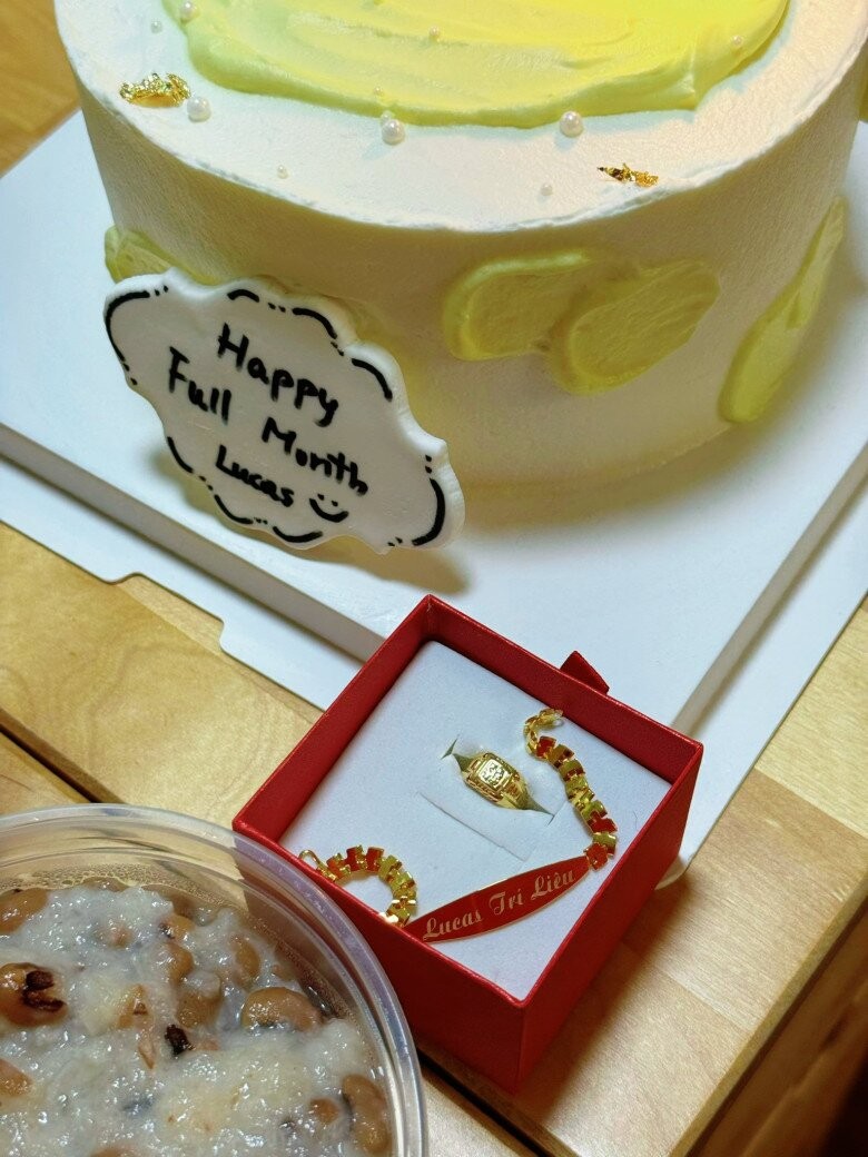 Xôi ngoại nấu công phu, ngoại nắn hình hoa hồng để con đường đời con trải đầy hoa rực rỡ. Chè ngoại tỉ mỉ nấu ngon ngọt ngào, vừa đủ để mong cuộc đời con ngọt bùi. Ba bé Ong được dặn mua hoa mua trái cây, ba mua hẳn hoa đẹp hoa to phải đỏ để Lucas may mắn. Trái cây 5 thứ ba chọn thì không đỏ cũng vàng, thơm to tròn. Bánh kem ngoại dặn mua cho bé Ong, ba cũng cầu kỳ đặt bánh kem hoa hồng, trái vải làm nhân bánh cho con” - Diễm Hương chia sẻ.