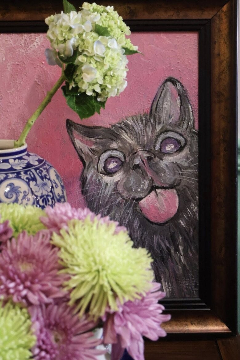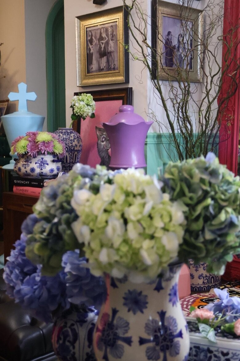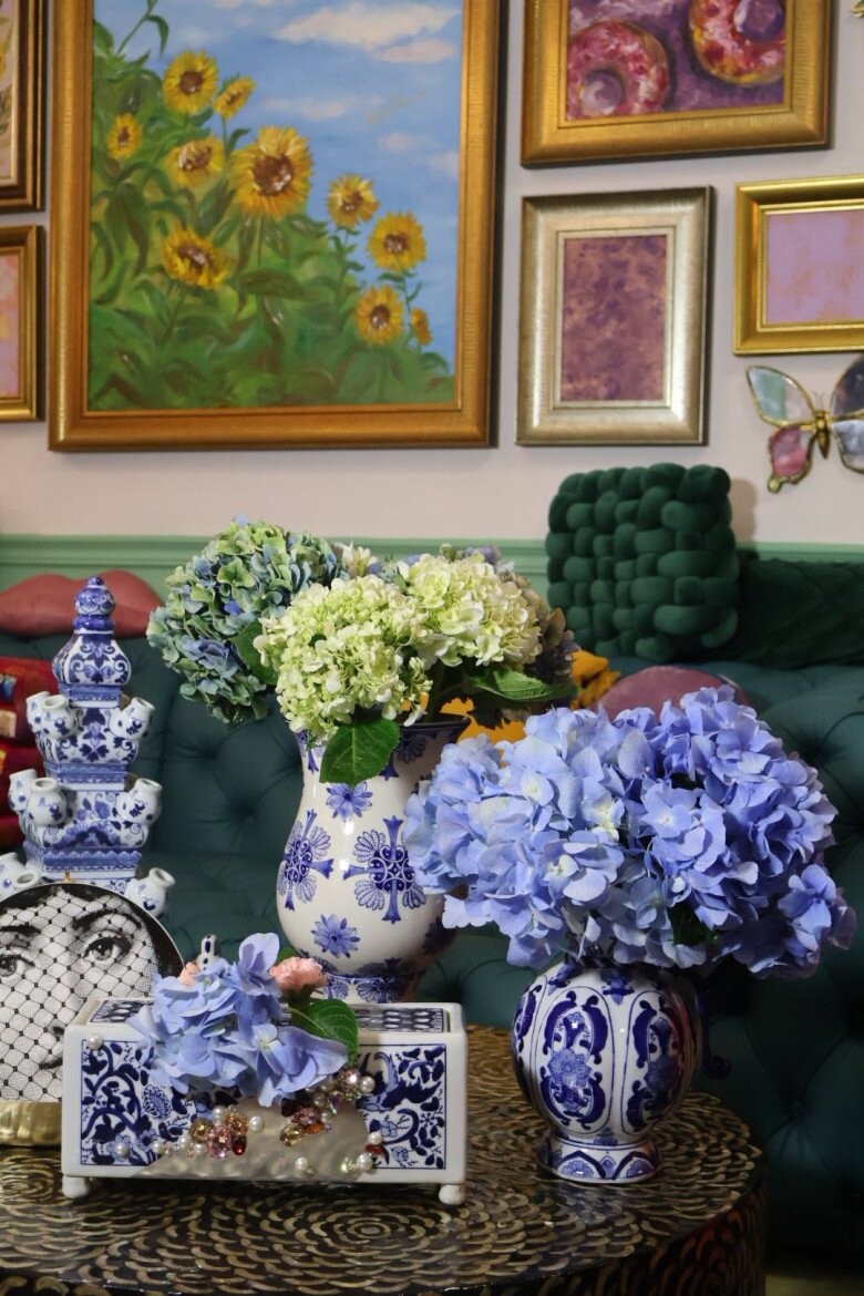 Bình hoa cẩm tú cầu màu xanh lơ nổi bật trước nền tường và tranh màu pastel, hài hòa trong tổng thể không gian nhiều sắc độ nhưng không hề rối mắt.