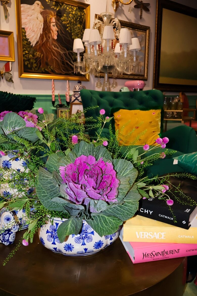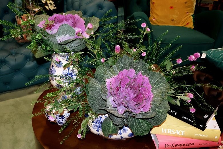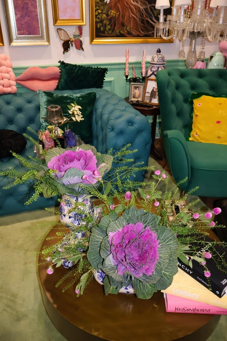 Góc phòng nổi bật với hai lọ hoa bắp cải đặt cạnh nhau, hài hoà với nội thất như ghế nhung xanh rêu, gối vàng thêu tay và tường xanh pastel, tạo nên khung cảnh như một bức tranh sống động.