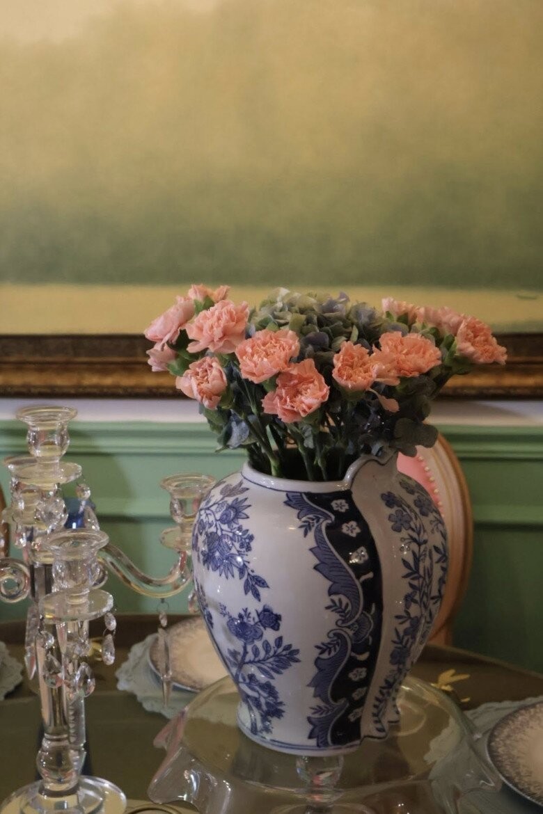 Cô bày tỏ: "Hoa em Thu cắm. Bộ gốm lam em Thu sưu tầm". Lọ hoa cắm cẩm chướng màu hồng pastel xen lẫn lá xanh nhẹ nhàng, đặt trong bình gốm họa tiết đối xứng cổ điển.
