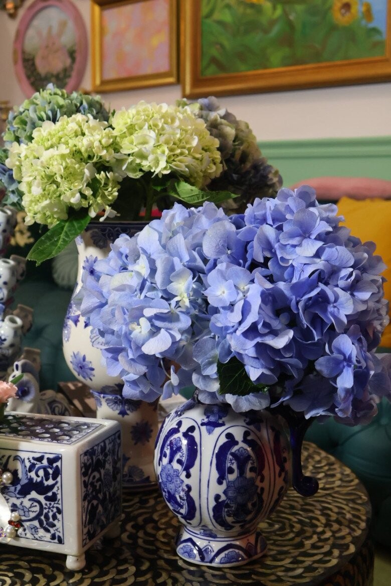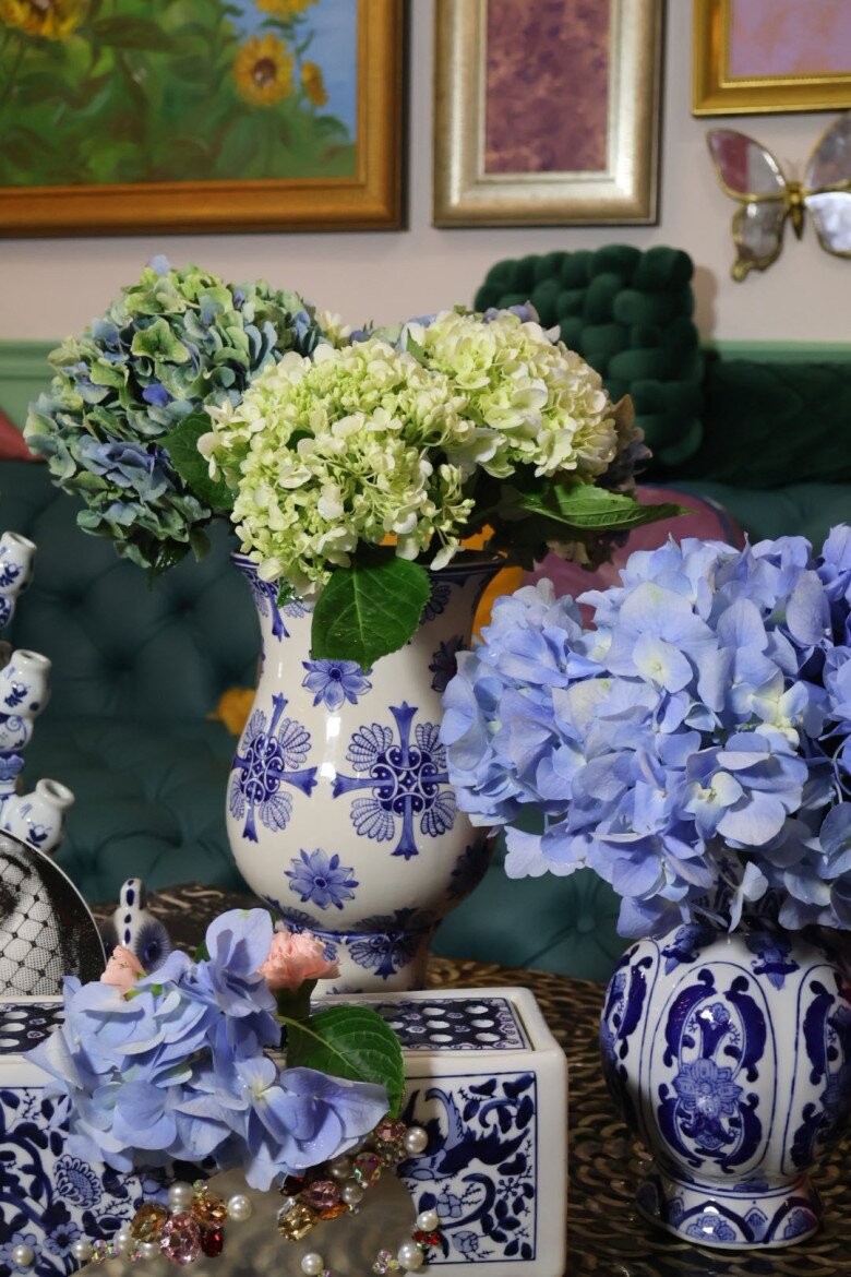 Một lần khác, Phan Hoàng Thu từng khoe những bình hoa khác của mình. Góc nhà thêm rực rỡ với bình hoa cẩm tú cầu xanh và trắng, kết hợp cùng gốm lam – cho thấy sự chỉn chu và đam mê sưu tầm gốm của chủ nhân.