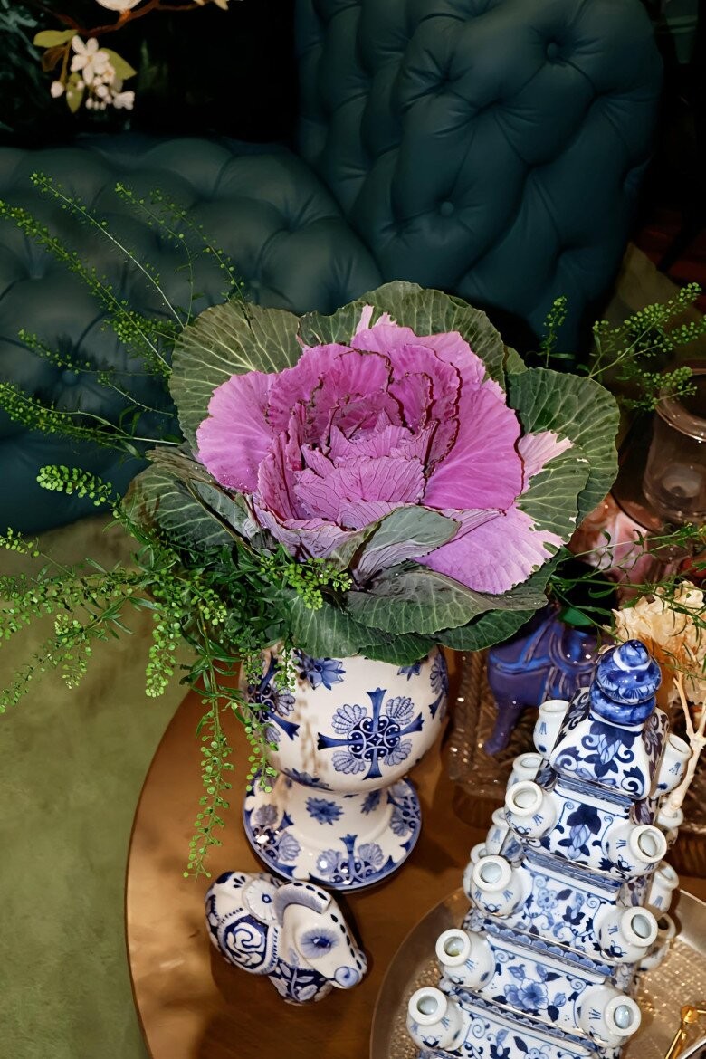 Cận cảnh hoa bắp cải tím nở đều, từng lớp cánh xếp lớp như hoa mẫu đơn, được nâng đỡ bởi phần lá xanh tươi và xốp cắm giấu kỹ trong bình sứ.