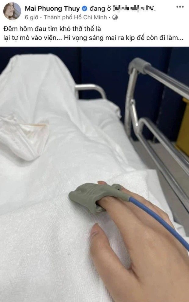 Là người đẹp có thân hình khỏe khoắn, tự nhận bản thân "khổng lồ", thế nhưng Mai Phương Thúy đã nhiều lần nhập viện khiến bạn bè và người hâm mộ lo "sốt vó". Trước đó, vào giữa năm 2021, cô từng vào viện lúc nửa đêm vì đau tim, khó thở. Đăng tải bức ảnh đang đo điện tim, nàng Hậu cho biết: "Đêm hôm đau tim khó thở thế là lại tự mò vào viện. Hy vọng sáng mai ra kịp để còn đi làm".