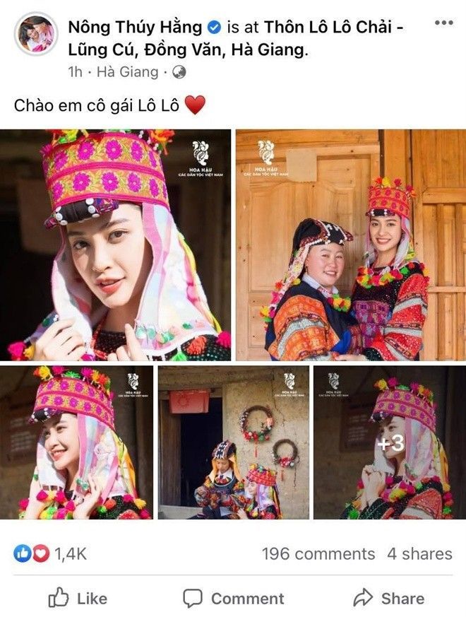 Ít giờ trước, Hoa hậu các Dân tộc Việt Nam 2022 Nông Thúy Hằng đăng tải nhiều khoảnh khắc xinh đẹp trong bộ trang phục dân tộc Lô Lô. Kèm theo loạt ảnh, nàng Hậu hào hứng chú thích: "Chào em cô gái Lô Lô". Nhiều bạn bè, người hâm mộ của Nông Thúy Hằng đã dành lời khen cho tạo hình đặc biệt này của cô.