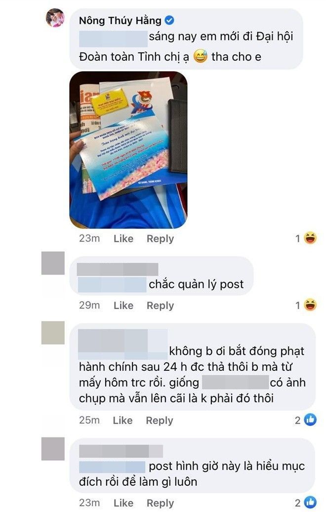 Sau đó, người đẹp còn xin cộng đồng mạng buông tha cho mình vì liên tục nhận những bình luận kém duyên. Cô đăng tiếp một bức ảnh, cho biết sáng nay vừa đi dự sự kiện kèm dòng chú thích: "Sáng nay em mới đi Đại hội Đoàn toàn tỉnh. Tha cho em". Cô nói thêm: "Nhưng không ai bị bắt mà có tư cách làm đại biểu danh dự của Đại hội Đoàn thanh niên ạ", "Em chỉ có ảnh chụp với các anh ở đồn biên phòng thôi. Chưa có dịp được đến thăm các anh công an"...