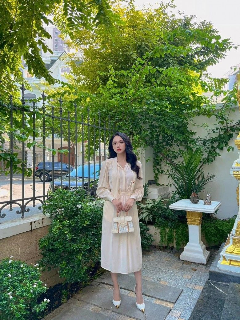 Diện set đồ chỉ mang một màu sắc cơ bản là màu be, Hương Giang vẫn hút chặt mắt người nhìn với vibe nàng thơ thanh lịch, yêu kiều.