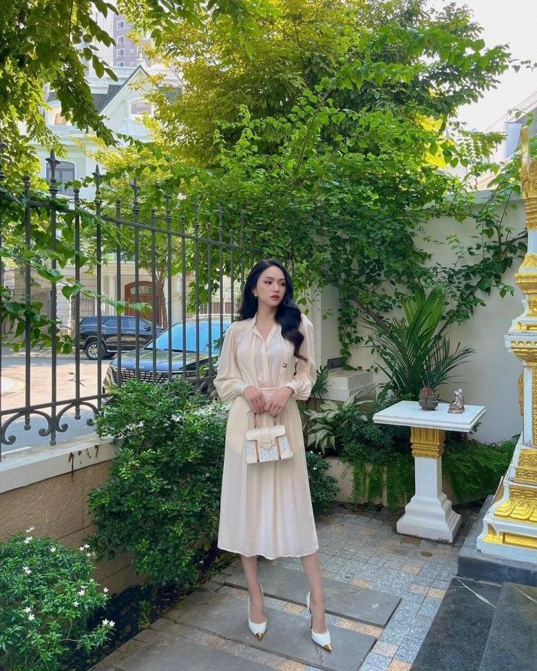 Set đồ đậm chất công sở là áo sơ mi blouse, chân váy xòe trùm gối. Cô mix & match với phụ kiện là cao gót mũi nhọn cùng túi xách hàng hiệu tông xuyệt tông.
