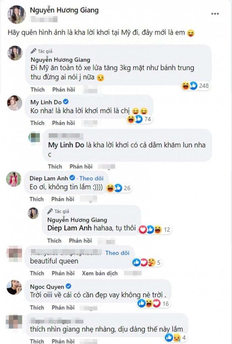 Hương Giang dí dỏm đăng tải lên trang cá nhân với dòng chú thích hãy quên hình ảnh cô ăn diện mát mẻ tại trời Mỹ đi, kín đáo, thanh lịch mới chính là cô. Ngay lập tức, bên dưới bài đăng, hàng loạt tài khoản có tick xanh là các ngôi sao nổi tiếng vào bình luận. Đỗ Mỹ Linh cho rằng hình ảnh ăn mặc phóng khoáng đó mới chính là Hương Giang, Diệp Lâm Anh lại khăng khăng, kín cổng cao tường như trên lại không đáng tin.