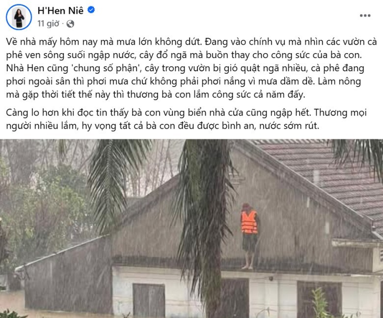 H'Hen Niê bày tỏ: "Về nhà mấy hôm nay mà mưa lớn không dứt. Đang vào chính vụ mà nhìn các vườn cà phê ven sông suối ngập nước, cây đổ ngã mà buồn thay cho công sức của bà con.